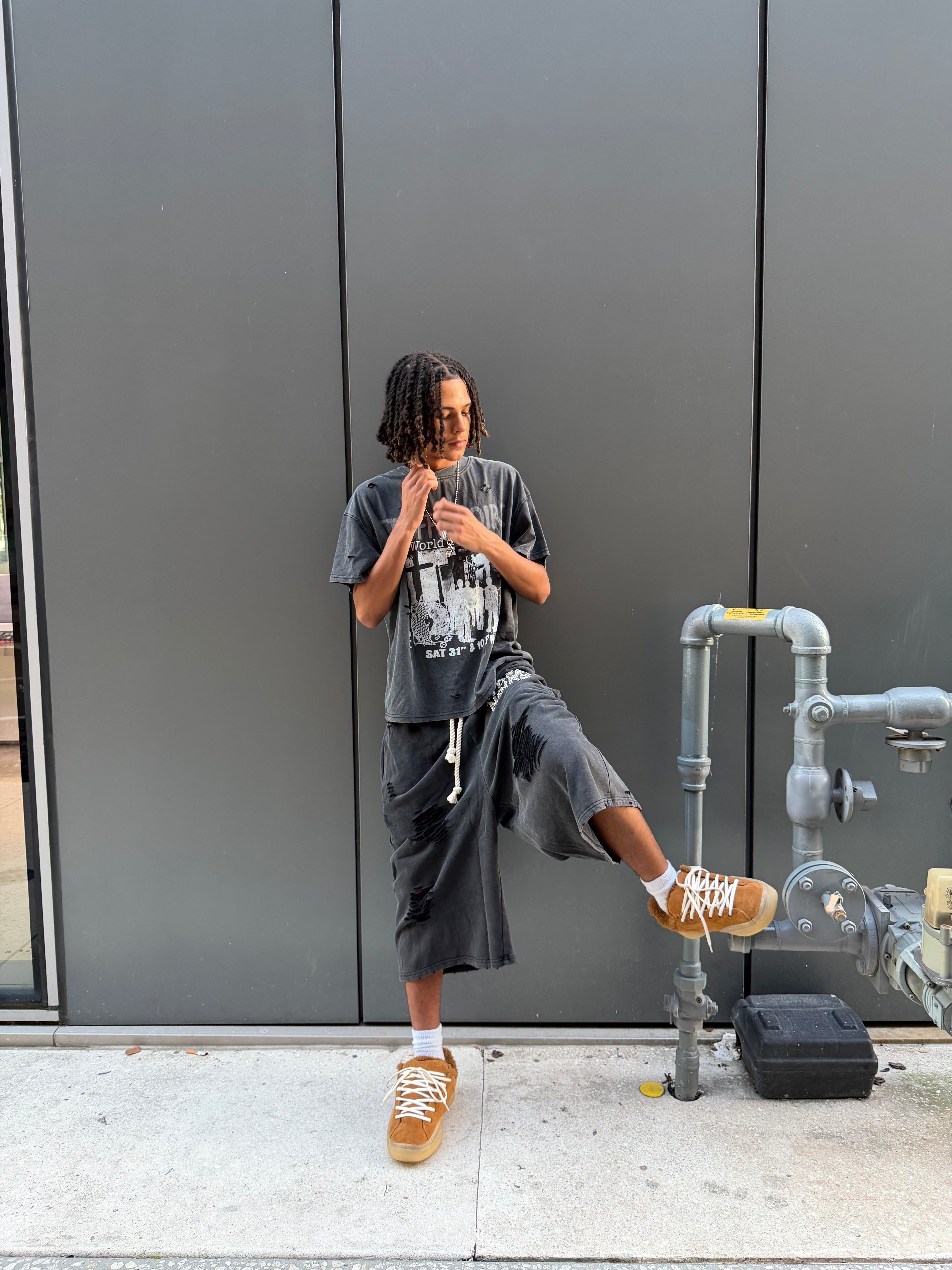 Distressed cut-outs throughout for a worn-in, deconstructed look